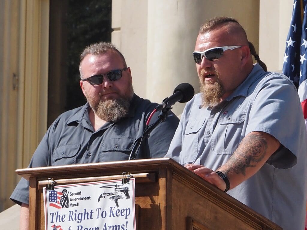 WilliamNull(right)andhistwinbrotherMichaelNull(left)whowereacquittedofchargesrelatedtothe2020plottokidnapMichiganGovernorGretchenWhitmerspeakataaSecondAmendmentMarcheventoutsidetheMichiganCapitolBuildingonSept.19,2024.|Photo:AnnaLizNichols