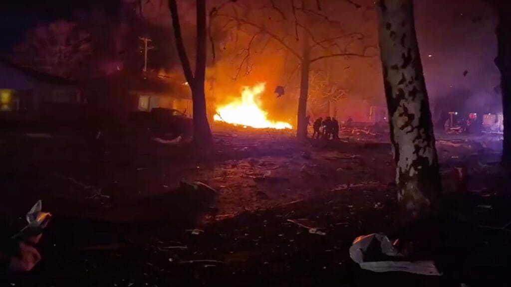 There’s debris – including siding and clothes – from the suspected explosion that is littering the street. Neighboring homes also had windows blown out.